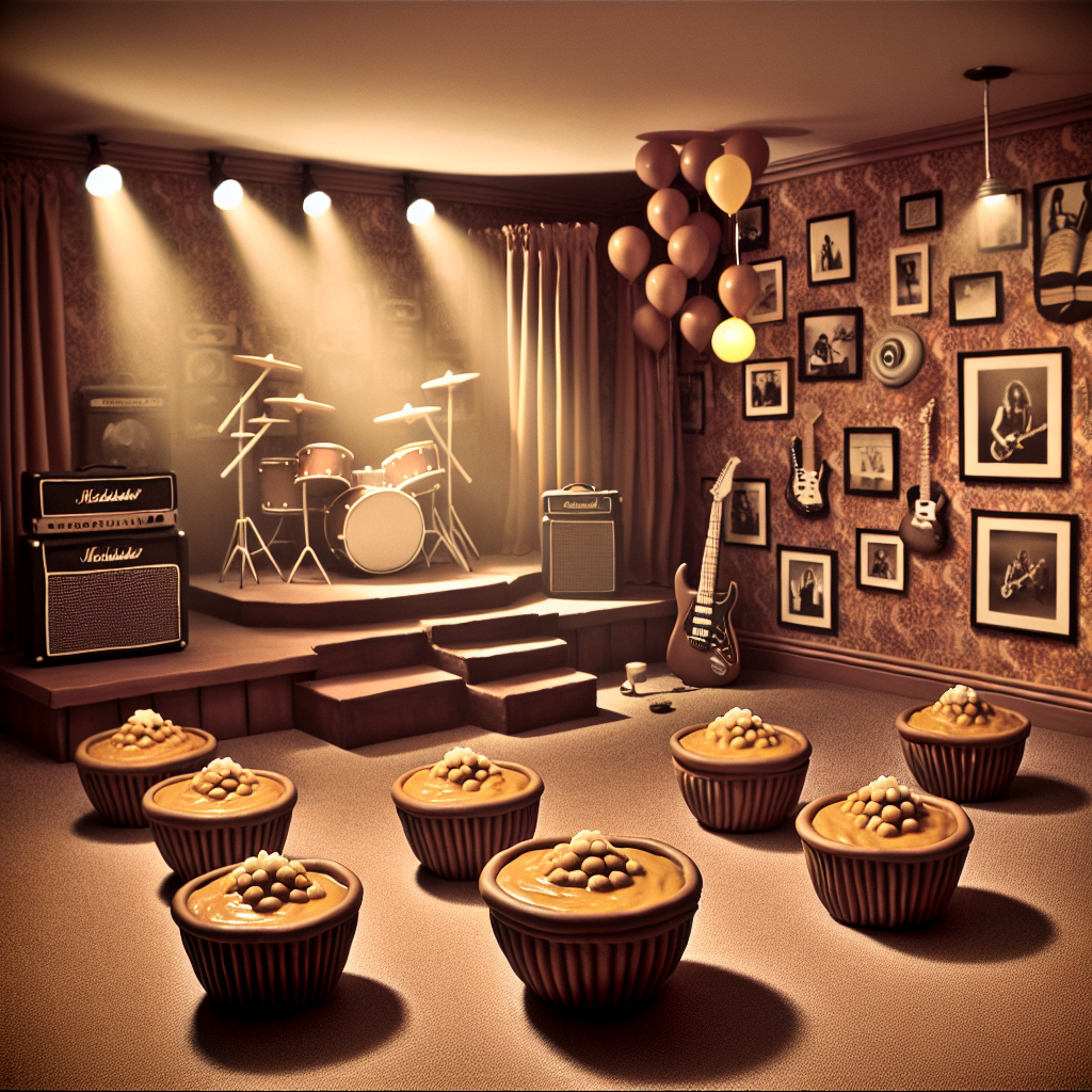 Picture a room embodying the aura of a nostalgic rock concert, adorned with a warm and inviting palette. Along its edges, spot a series of intricately crafted cupcakes uncannily resembling bowls of curry, exuding an endearing realism. The room is suffused with ambient lighting, mimicking the gentle glow of stage lights, as a compilation of classic rock tunes is subtly mixed in the atmosphere. Overhead, an eclectic mix of balloons, some shaped like electric guitars, is peppered, augmenting the resemblance to a festival-like birthday atmosphere.