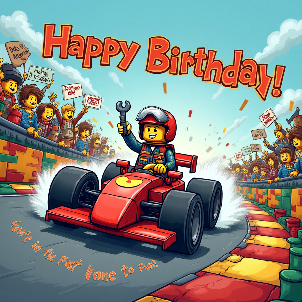 Beneath the speeding Lego F1 car, a small plume of exhaust forms the words, "You're in the fast lane to fun!" adding a whimsical touch to the lively birthday scene.
