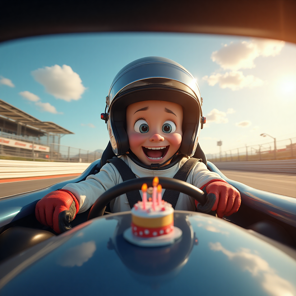 Capture a humorous and exhilarating moment of William in a sleek BMW race car, with a bright, sunny day illuminating the scene. William, wide-eyed and grinning, is seated in the driver's seat, donning oversized racing gloves and an amusingly large helmet that looks a bit too big for his head. The car zooms around a vibrant racetrack, with motion blur accentuating the speed and thrill of the moment. A playful detail is a small birthday cake, complete with candles, perched comically on the dashboard. The vivid colors, sharp details, and lifelike textures make the scene pop, creating an engaging and funny birthday greeting image in ultra-high-definition 4K UHD.