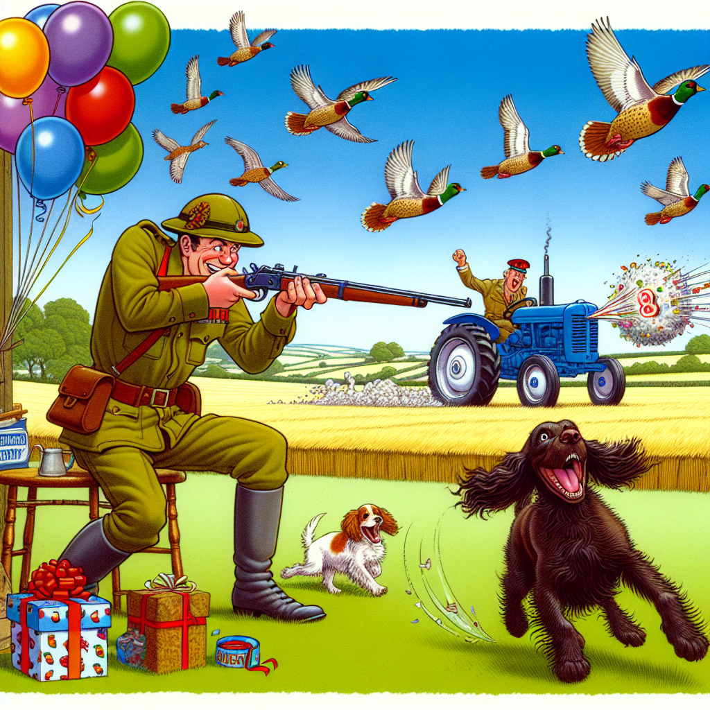 Visualize a humor-filled cartoon for a birthday greeting card, influenced by the whimsy of a scene set in the countryside of Wales. In the prominent section, there's a Caucasian male British soldier, grinning amusingly as he aims a humorously exaggerated rifle at flying pheasants. Next to him, a delighted spaniel jumps with boundless excitement. In the distance, a blue tractor decorated with birthday balloons moves across a field. Surprisingly, the tractor's exhaust pipe billows with pieces of lingerie, insinuating a humorous accident at a birthday party. The style should favor a vibrant color palette and amusingly overstated features to trigger laughter and joy.