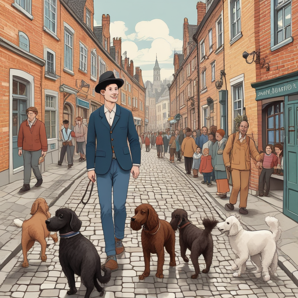 Illustration Cute, Generate an image of a charming birthday-themed illustration depicting a quaint street scene in Belgium, populated by diverse individuals. Some are Caucasian, while others are Black, Hispanic, Middle-Eastern, and South Asian. The men, women and non-binary persons, amicably strolling with their poodles across the cobblestones. The celebratory ambiance is accentuated by vibrant balloons and banners against the backdrop of a clear sky. In the center of the illustration, a cobblestone square filled with various people: men, women, and non-binary of differing descents, clinking their cocktail glasses in celebration. Nearby, a patisserie showcases a 'Happy Birthday' sign.