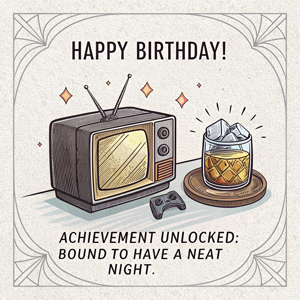 Hand-drawn illustration with fine linework and textured brush strokes. Balanced composition: in the center, a glowing retro CRT TV with subtle scanlines and an 8-bit pause icon. Left foreground: a crystal rocks glass of whiskey (neat), catching warm amber highlights. Right foreground: an ashtray shaped like a classic game cartridge cradling a smoldering cigar; its smoke curls into playful pixel hearts and neon squiggles. Across the coffee table, a vintage game controller with its cable tied into a neat, silky bow; a pair of fuzzy cuffs clipped cheekily to one grip—suggestive but lighthearted. Scatter arcade tokens, cassette tapes, and neon 80s/90s Memphis-style shapes as confetti. Warm, expressive color palette of bourbon ambers, wood browns, and pops of neon magenta and cyan; soft paper grain, gentle vignette, and cozy lamplight glow. Funny, nostalgic vibe blending cigars, whiskey, video games, 80s/90s pop flair, and tongue-in-cheek kink.