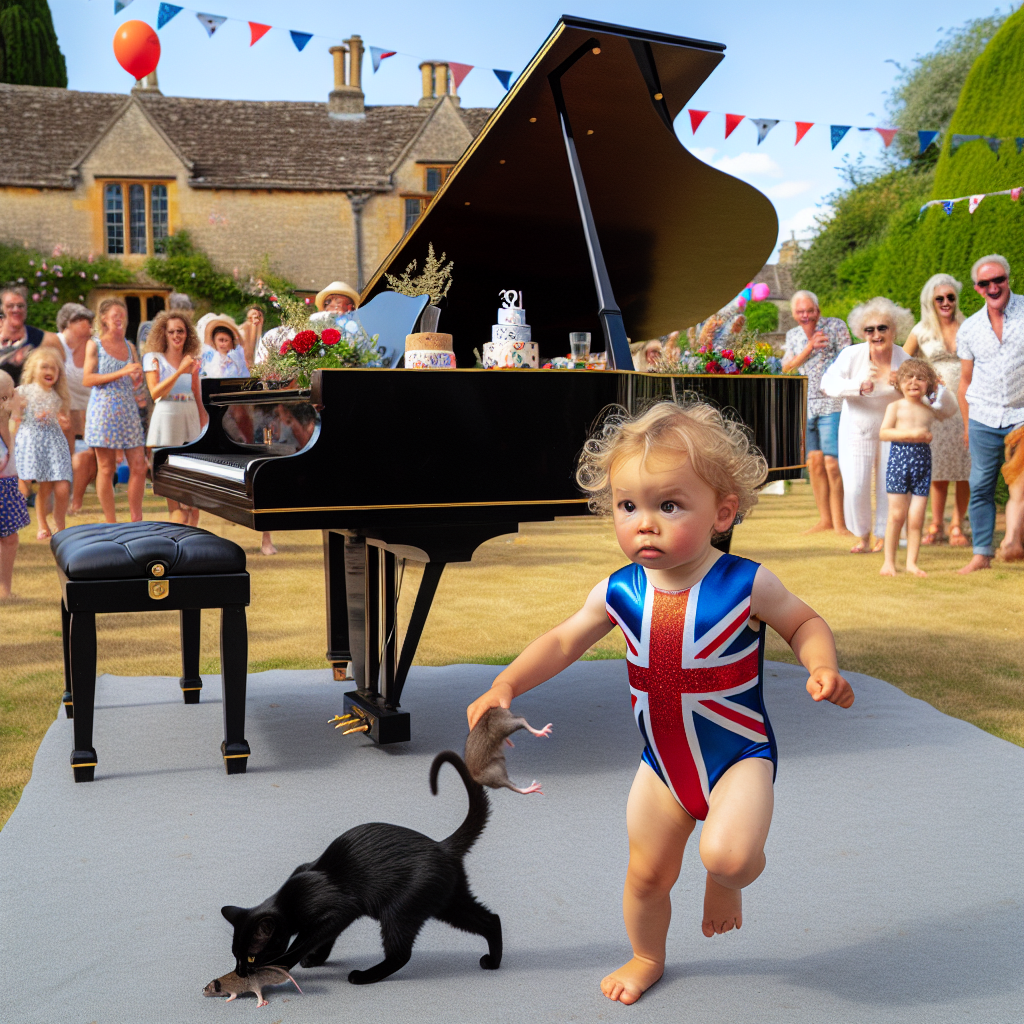 Picture a lively quaint summer fest, taking place in the beautiful Cotswolds, which is serving as a unique backdrop for a 32nd birthday celebration. A Caucasian toddler with light curly hair, dressed in a gymnastics leotard representing UK, is energetically toddling around. Nearby, a grand black grand piano, festooned with birthday decorations, sits in a commanding stance. In the midst of this cheerful chaos, a slick black cat nonchalantly walks across the crowd, amusingly presenting a dead mouse in its mouth, adding a touch of unexpected realism to the bucolic celebration.