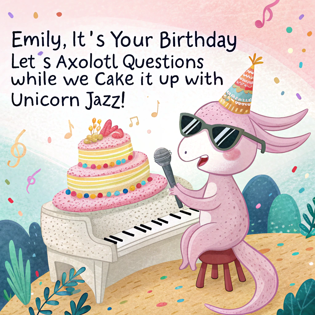 At the top of the image, "Emily, it’s your birthday—let’s axolotl questions while we cake it up with unicorn jazz!"