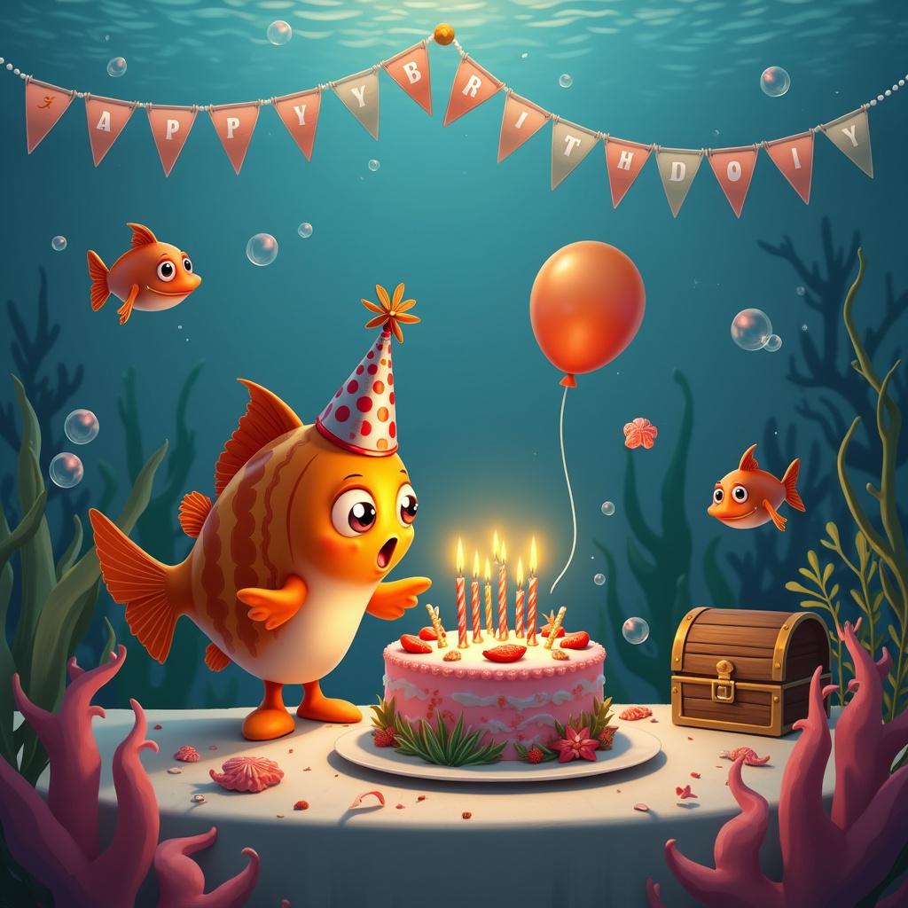The party is further decorated with fish-shaped balloons that glimmer with glitter, tied to a treasure chest, and a banner proclaiming "Happy Birthday!" crafted from seashell letters strung on a beautiful pearl necklace. In the backdrop, wavy sea grass sways gently along with floating bubbles and a sunken ship appearing faintly in the distance. Adding to the vibrant atmosphere are cheerful sea life, with smiling shrimp, camouflaged crabs, and dancing eels, while pearl-studded starfish are scattered around and jellyfish lanterns hang gracefully from above, illuminating the scene.