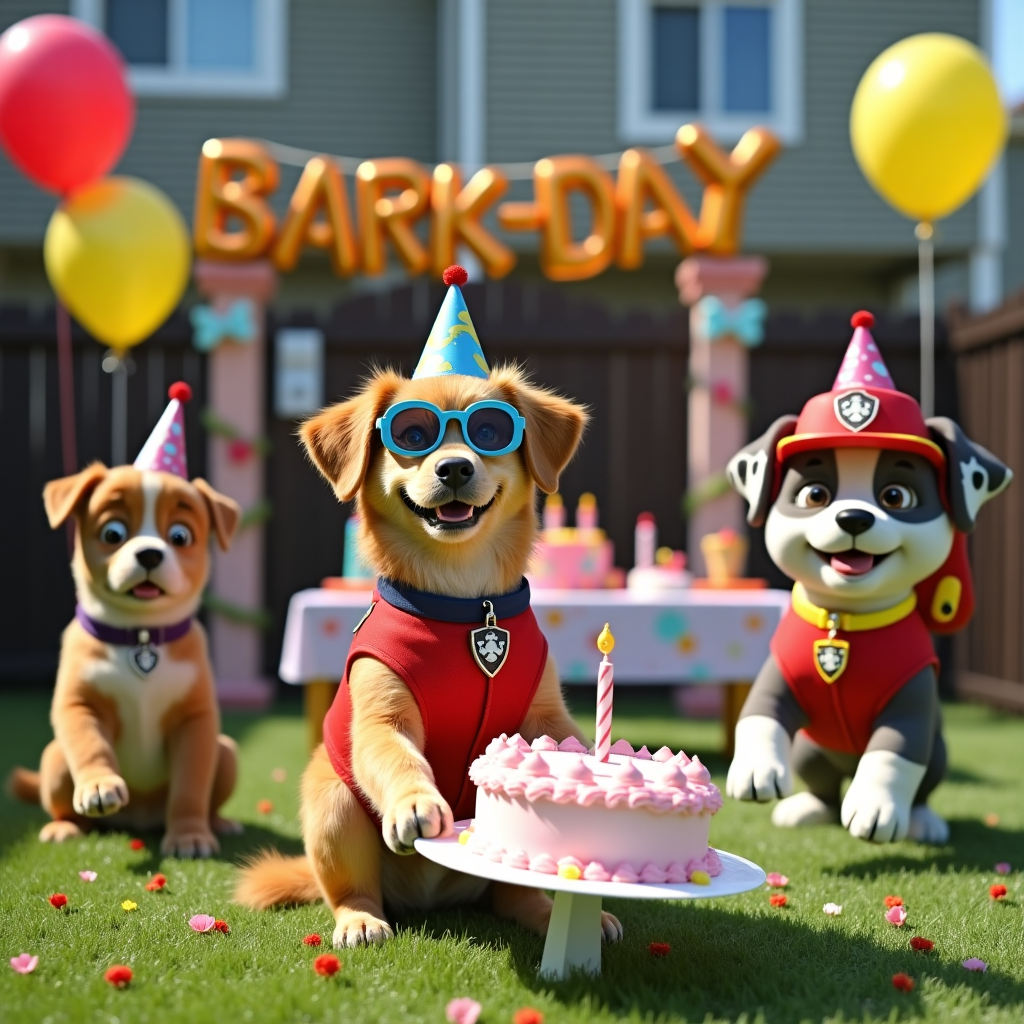A hyper-realistic photograph of a suburban backyard transformed into a full-blown Paw Patrol-themed birthday party scene — think highly detailed, photo-real costumed dogs resembling Paw Patrol characters, but portrayed as actual real-life dogs in silly handmade costumes (not cartoons), complete with mini hats, sunglasses, and party blowers. One golden retriever dressed like Chase is clumsily holding a birthday cake with his paws, looking like it might topple over, while a French bulldog dressed as Skye zooms past in a remote-control toy helicopter. The birthday table is full of hilariously overdone dog-themed snacks and one clearly confused cat wearing a birthday hat hiding under it. Balloons everywhere spell out "Bark-Day Bash!" and there's a photo booth in the background with ridiculous props like bone-shaped glasses. The vibe is joyful chaos — like someone gave the pups too much sugar. Natural daylight with bright, vibrant colors and comedic expressions frozen mid-action.