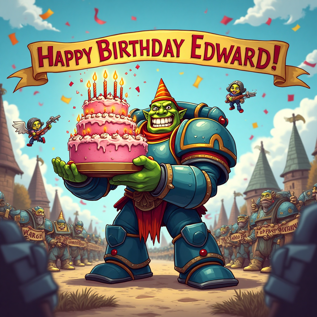 Create a vibrant and playful cartoon scene set in a whimsical Warhammer universe. Imagine a joyful and exaggerated Warhammer character, perhaps a jovial Space Marine or an Ork with a big, friendly grin. They are holding a towering birthday cake covered in brightly colored frosting and candles, with exaggeratedly large hands. Surrounding the character are adorable miniatures of Warhammer figures, celebrating in energetic poses with confetti raining down. The background is a lively battlefield transformed into a cheerful party scene, with banners reading "WAAAGH-PY BIRTHDAY" fluttering in the wind. The overall atmosphere is one of sincere joy and celebration, with bright, saturated colors bringing the whimsical world to life.