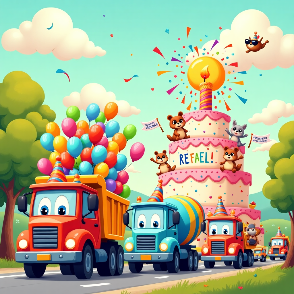 In the foreground of this playful cartoon scene, a colorful convoy of anthropomorphic trucks is having a grand birthday parade for Refael. Each truck is adorned with whimsical party hats and bright, streamers flowing in the wind. The leading truck, a vibrant red dump truck, has its bed filled with balloons of every color imaginable, forming a floating rainbow above it. The truck's friendly face, with large round eyes and a cheerful smile, is looking straight at you, inviting you to join the fun. Next to it, a jolly blue cement mixer spins a barrel with sprinkles and confetti shooting out like a party cannon, showering the scene with festive cheer.