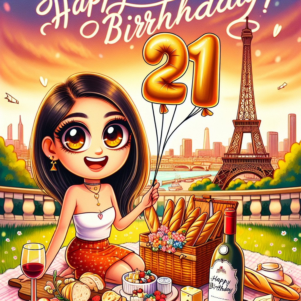 Create a charming cartoon illustration with a birthday theme celebrating a 21st birthday in Paris. The scene unfolds against a backdrop of the Eiffel Tower. A picnic under a warmly hued sky is spread out, filled with crispy French baguettes, an assortment of cheese, and a bottle of fine wine, playfully labeled with the number '21', adding celebratory flair. The central figure, a South Asian woman celebrating her 21st birthday, is drawn with oversized cheerful eyes. She affectionately holds a balloon crafted in the shape of '21', enhancing the enchanting allure of the birthday scene.