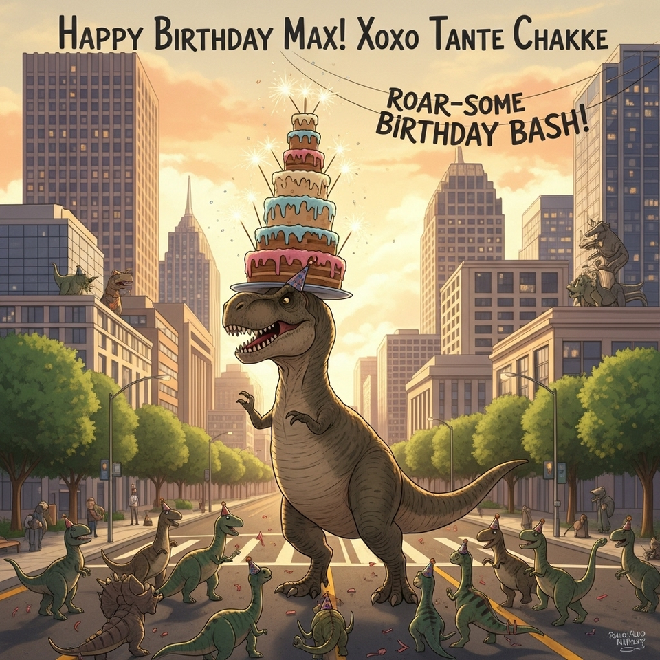 Generated with these themes: Birthday cake, Dinosaur , Palo alto city , and .