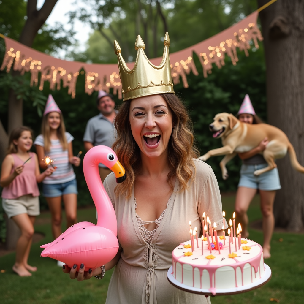 A highly detailed, realistic photograph of a surprise backyard birthday party in full chaotic swing. The central figure is a woman mid-laugh (meant to be Marilynn), wearing an oversized inflatable crown and holding a half-eaten cake in one hand and a garden flamingo in the other. Behind her, cousins of all ages are engaging in hilarious party antics: one cousin is tangled in bunting hanging from a tree, another is trying to light sparklers with a hair dryer, and a golden retriever is running through the yard with someone’s birthday hat in its mouth. There’s a giant, glittery banner crookedly strung between two trees reading “Happy Birthday, Cuz!” and a giant cake with candles all melting in different directions. The vibe is joyful, spontaneous, and cheeky, full of cousin-bonding silliness, with warm lighting suggesting late afternoon fun.