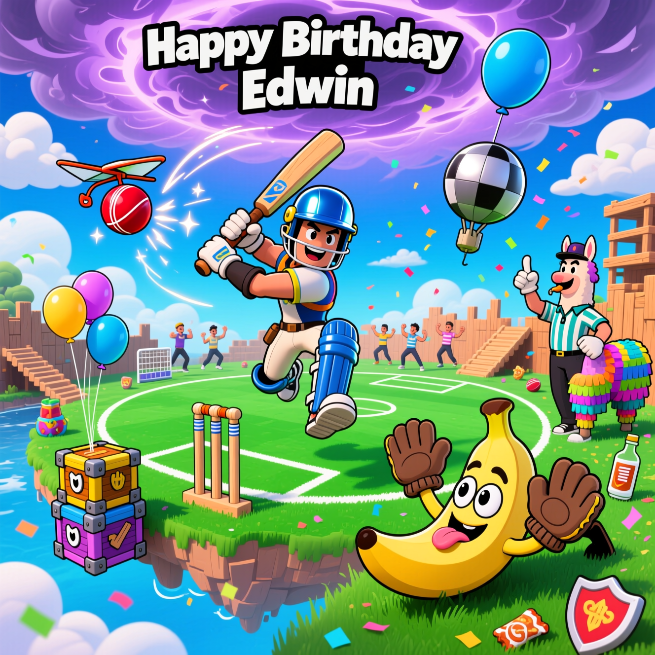 A playful, funny, high-energy Cartoon Style scene blending Fortnite and cricket: