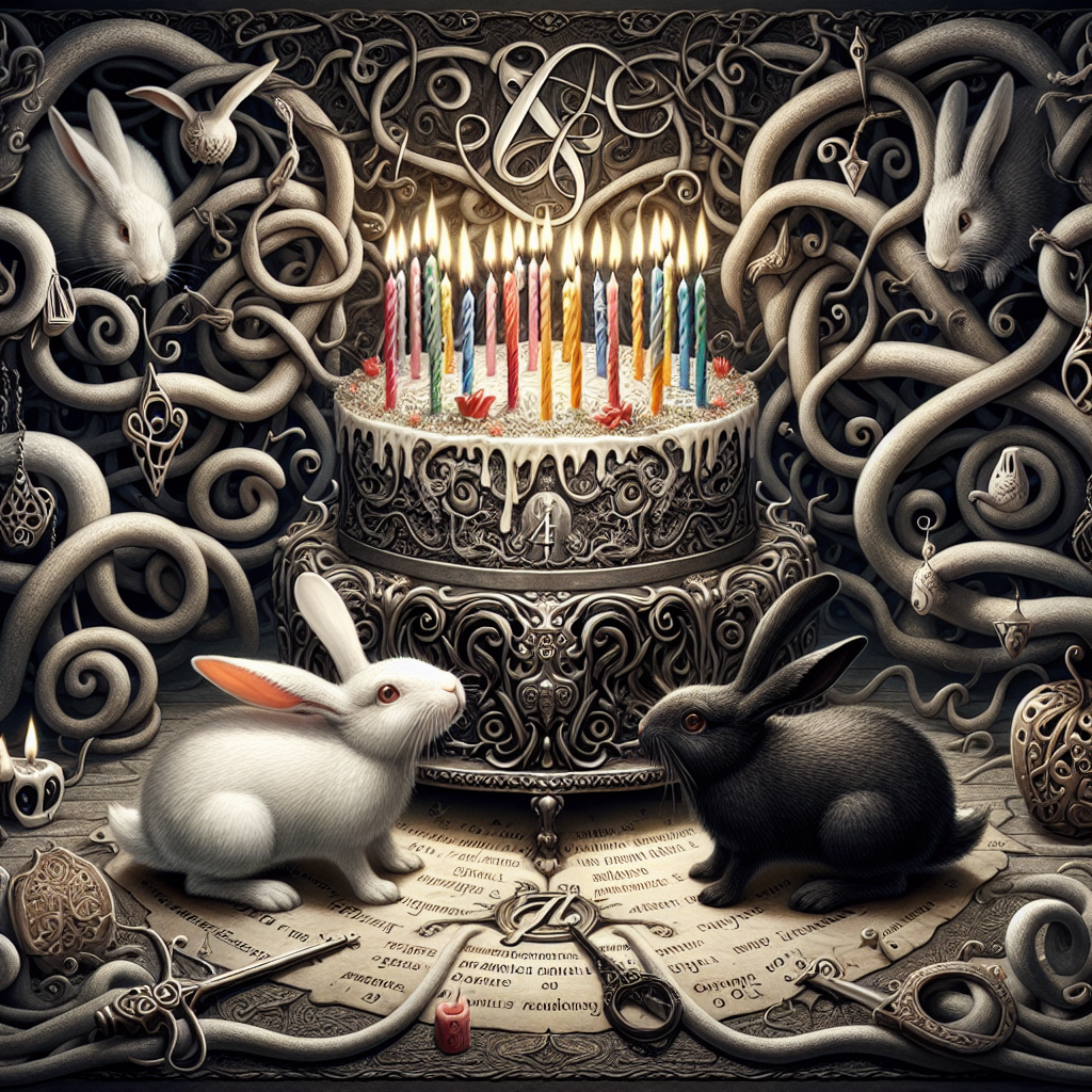 Imagine a whimsical birthday scene with a gothic touch. A white rabbit and a black rabbit, serve as enigmatic guides, symbolizing the yin and yang of perspectives. They with through an environment surrounded by winding vines and archaic symbols that lie along the borders, symbolizing the complexity and intricate beauty of the mind. Each element is a representation of individuality, acknowledging the distinct thoughts and perspectives of an individual with Autism or ADHD. Amidst this chaos, the rabbits are jumping around an ornate antique-style birthday cake. Flickering candles sit atop this cake, inviting the viewer to appreciate uniqueness and the extraordinary in everyday life.