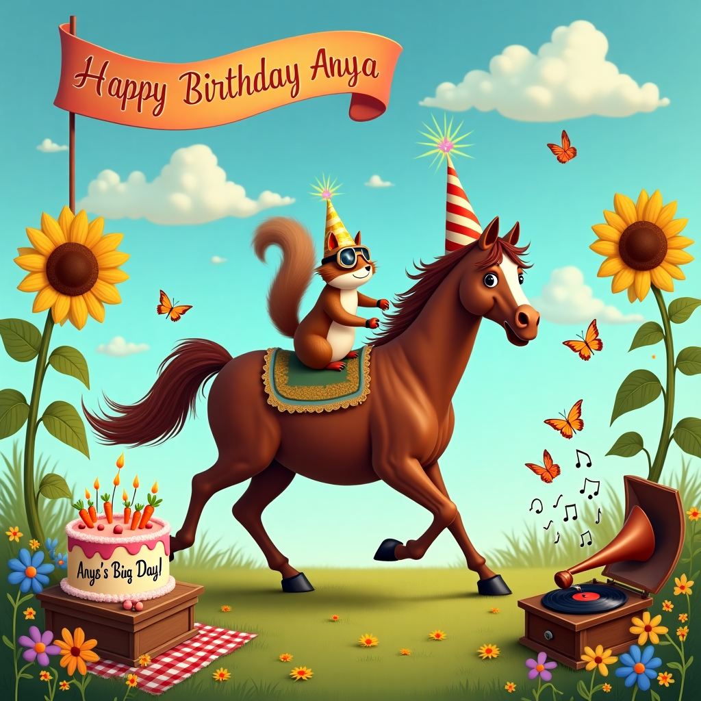 In the vibrant and whimsical scene, a charismatic chestnut horse, sporting an oversized party hat with polka dots, prances joyfully in the middle of a lush, flower-dotted meadow. On its back, perched with gleeful determination, sits a cheeky squirrel wearing tiny aviator goggles, gripping onto the horse's mane like a daring co-pilot. Above them, the sky is a bright, azure canvas with fluffy clouds whimsically shaped into letters that spell "Happy Birthday Anya," drifting lazily across the horizon. In the foreground, a large, rainbow-colored banner stretches between two tall, swaying sunflowers. The banner features a comically large birthday cake graphic, complete with candles and a single lit candle at the very top. On the cake, in frosting-like lettering, is inscribed “Anya’s Big Day!” To the side, a cluster of playful butterflies, painted in dazzling blues and yellows, flutter around a picnic basket brimming with oversized carrots and sugar cubes, a treat laid out for the horse. Near the basket, an old-fashioned gramophone, inexplicably placed, has a vinyl record spinning, with musical notes drawn whimsically emerging from its horn, dancing their way toward the horse and squirrel duo, who seem to be in the middle of their own festive choreography.