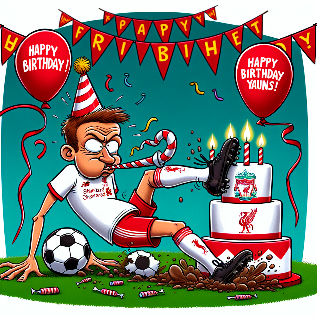 Depict a birthday scene inspired by football humor, particularly centered around the spirit of a well-known football club from Liverpool. In the forefront, have a cartoon representation of an unidentifiable football player comically tripping over a ball with a party horn in his mouth. He is balancing a birthday cake, shaped like the aforementioned football club's logo, on one knee, which appears to be wobbling dangerously. Surround him with balloons that have clever, light-hearted taunts appropriate for a birthday celebration. Adorn the border of the image with streamers in the club's primary colours: red and white, embodying a jovial, sport-inspired birthday scenario.