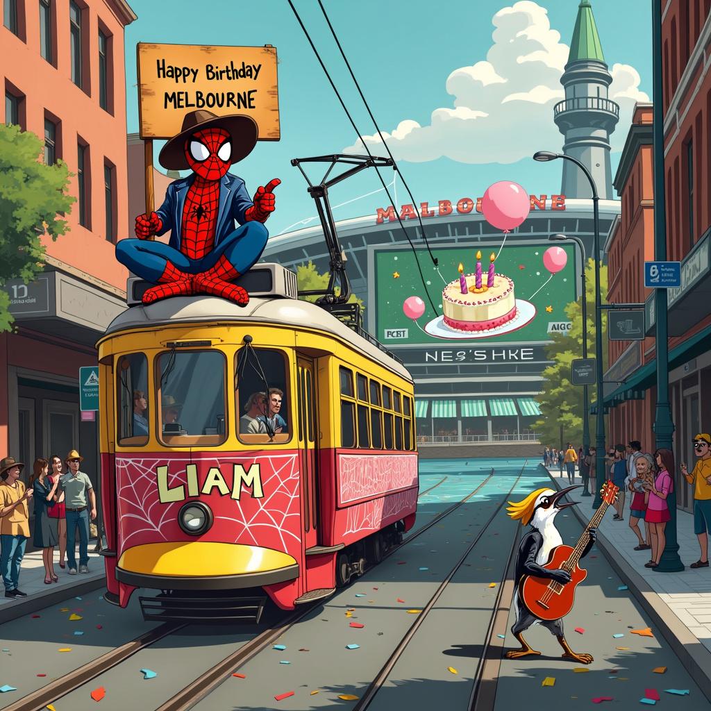 In this comical birthday scenario set on the lively streets of a cartoon Melbourne, Spider Man, outfitted with a bushranger's hat, perches atop a tram draped in a 'Happy Birthday Liam' sign. Australia's landmarks are amusingly reimagined; the MCG is a giant birthday cake, with scoreboard displaying birthday wishes, and the Yarra River is decorated with floating balloons and confetti. Liam’s name takes center stage on a large graffiti mural featuring an electric guitar with a spider web design, the mural occupies the side of a quaint, laneway café. Party-goers, a mix of locals and wildlife like koalas and cockatoos, cheer as a kookaburra plays a joyous tune on an electric guitar by the banks of the river. Each detail is crafted, from the intricate guitar strings to the comical expressions of each character engaging in a unique Aussie birthday bash.