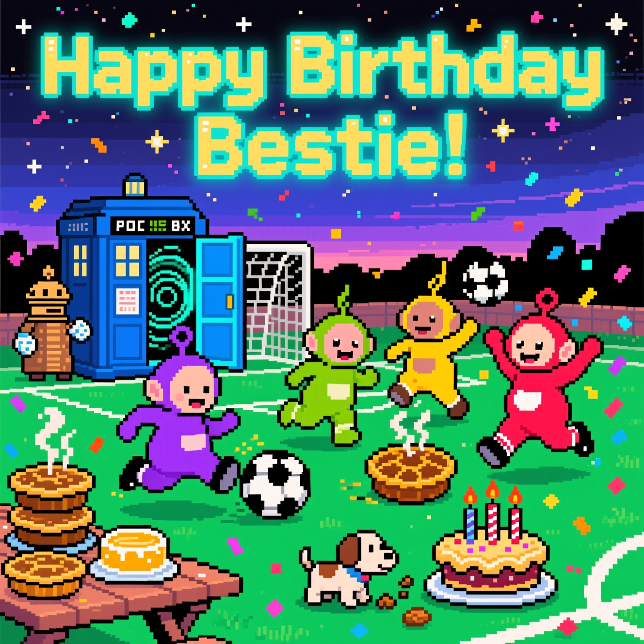 Crisp 8-bit pixel art with a vibrant, limited palette, chunky square pixels, and nostalgic video-game charm. A funny birthday scene on a bright green pixel football pitch under a starry twilight sky: a blue time-traveling police box as the goal, its open door glowing with a swirling time vortex. Four Teletubbies in retro pixel football kits (purple, green, yellow, red) sprint and celebrate with goofy expressions: one attempts a bicycle kick, one slides, one juggles a mini pie, one throws their hands up. The “football” is a golden-brown meat pie patterned like a soccer ball, little steam pixels rising. A grumpy pixel Dalek guards the goal in tiny keeper gloves, bracing for the incoming pie-ball. Sideline gag: a picnic table stacked with steaming pies and custard, a tiny robot dog sniffing crumbs, and a birthday pie with a few pixel candles. Confetti pixels, exaggerated motion lines, and star twinkles enhance the comedy. Strong black outlines, clean clusters, minimal dithering, bold saturated colors (electric blue, grass green, custard yellow, magenta, warm browns), with a subtle scanline shimmer for retro charm.