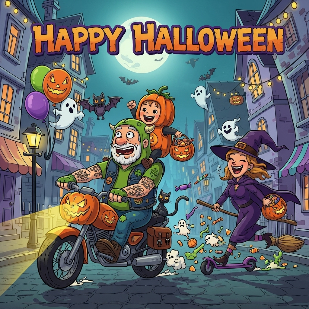 Large, playful Cartoon Style scene on a moonlit street in a spooky Halloween town: crooked pastel houses with grinning jack-o’-lanterns, string lights, bats, and friendly ghosts floating like balloons. Center stage, an Irish biker grandad with a big goofy grin and Celtic knot tattoos on his forearms is dressed as a green, stitched-up monster in a patched biker vest with a tiny shamrock patch; he’s popping a gentle, silly wheelie on a cartoon motorbike with a jack-o’-lantern headlight and exhaust puffs shaped like mini ghosts. Piggyback on his back, his delighted grandson in a plump pumpkin costume throws one arm up in triumph, the other clutching an overflowing candy basket. Beside them, the mom—dressed as a stylish witch with a tall bendy hat and sparkly purple cloak—laughs mid-stride, broom tucked under one arm like a scooter, her own basket brimming and bobbing. Trails of candy (wrapped sweets, gummy worms, candy corn) tumble comically from all their baskets, arcing through the air and bouncing along the cobblestones like a rainbow sugar spill. Add a cheeky black cat riding in the biker’s saddlebag nibbling a lollipop, a bat carrying a gummy worm, and motion lines that exaggerate their energetic poses. Exaggerated proportions, thick outlines, bright saturated colors (pumpkin orange, slime green, witchy purple, moonlit teal), simple shading, and big expressive faces for a funny, lively vibe.
