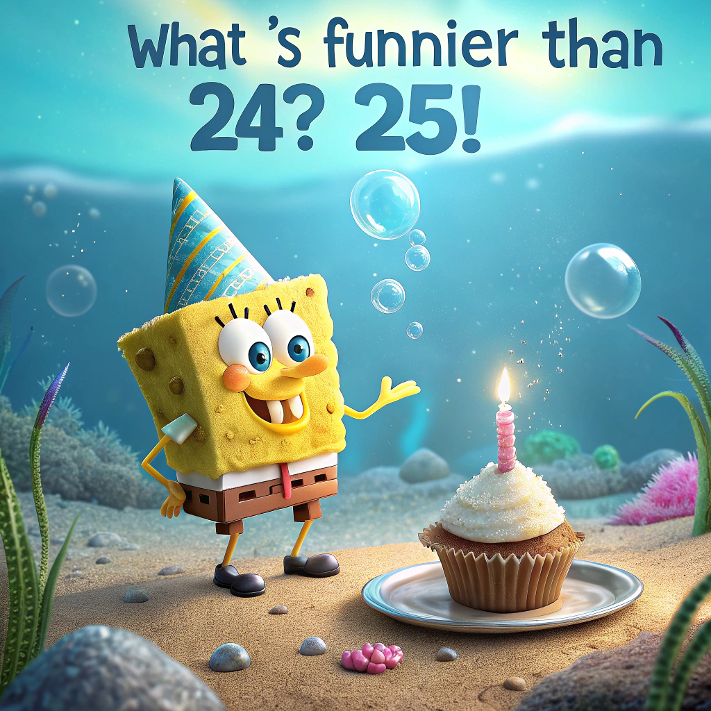 Ultra-high-definition 4K UHD, true-to-life studio tabletop scene with an underwater-party vibe. A clean, bright yellow household sponge stands upright on a sandy sprinkle of coarse sea-salt, wearing a tiny iridescent cone party hat. In front, a vanilla cupcake on a shell-shaped dish is topped with a lit metallic “25” candle; soft candle glow and a delicate curl of smoke add warmth. Scattered mini seashells and coral-pink confetti dot the scene while a few real soap bubbles drift through frame, catching crisp highlights. Aqua backdrop with realistic water-caustic light patterns for a playful “under the sea” feel. Camera: full-frame DSLR, 50mm prime, f/2.2 for creamy bokeh, ISO 100, 1/160s; focus sharp on the sponge pores and the candle. Lighting: soft diffused key from camera left, gentle rim from right for lifelike texture, accurate white balance. Typography for the headline: bold white bubble-lettering with a subtle teal gradient and soft drop shadow, centered and large across the top, high contrast for maximum readability and comedic punch. Color palette: sunshine yellow, seafoam teal, coral pink, pearl white. Mood: cheeky, celebratory, and photorealistic.