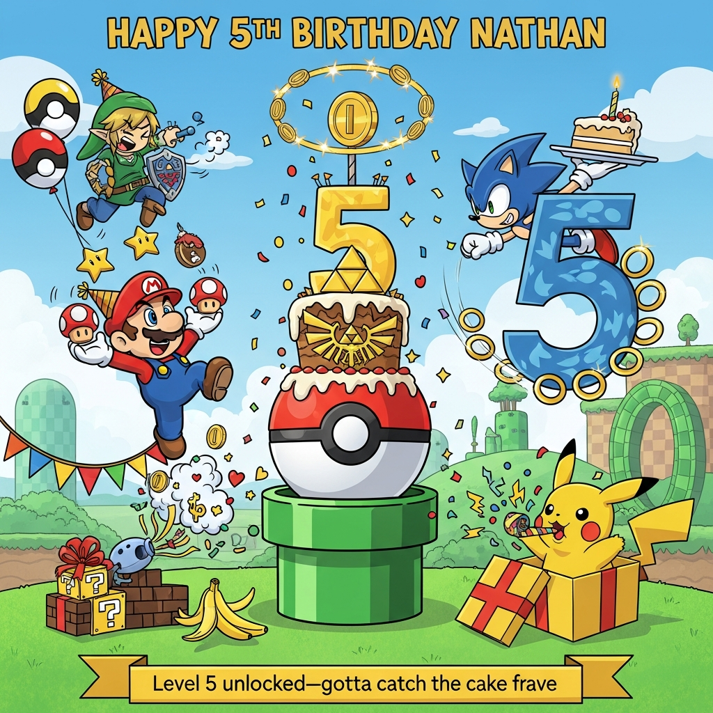Background: A playful blend of Mushroom Kingdom hills, Hyrule’s grassy field, and Green Hill Zone’s checker hills and loop silhouette. Poké Ball balloons, a few question-block gift boxes with bows, and rupee bunting. Bright daylight, soft cartoony shadows, clean, vibrant palette.