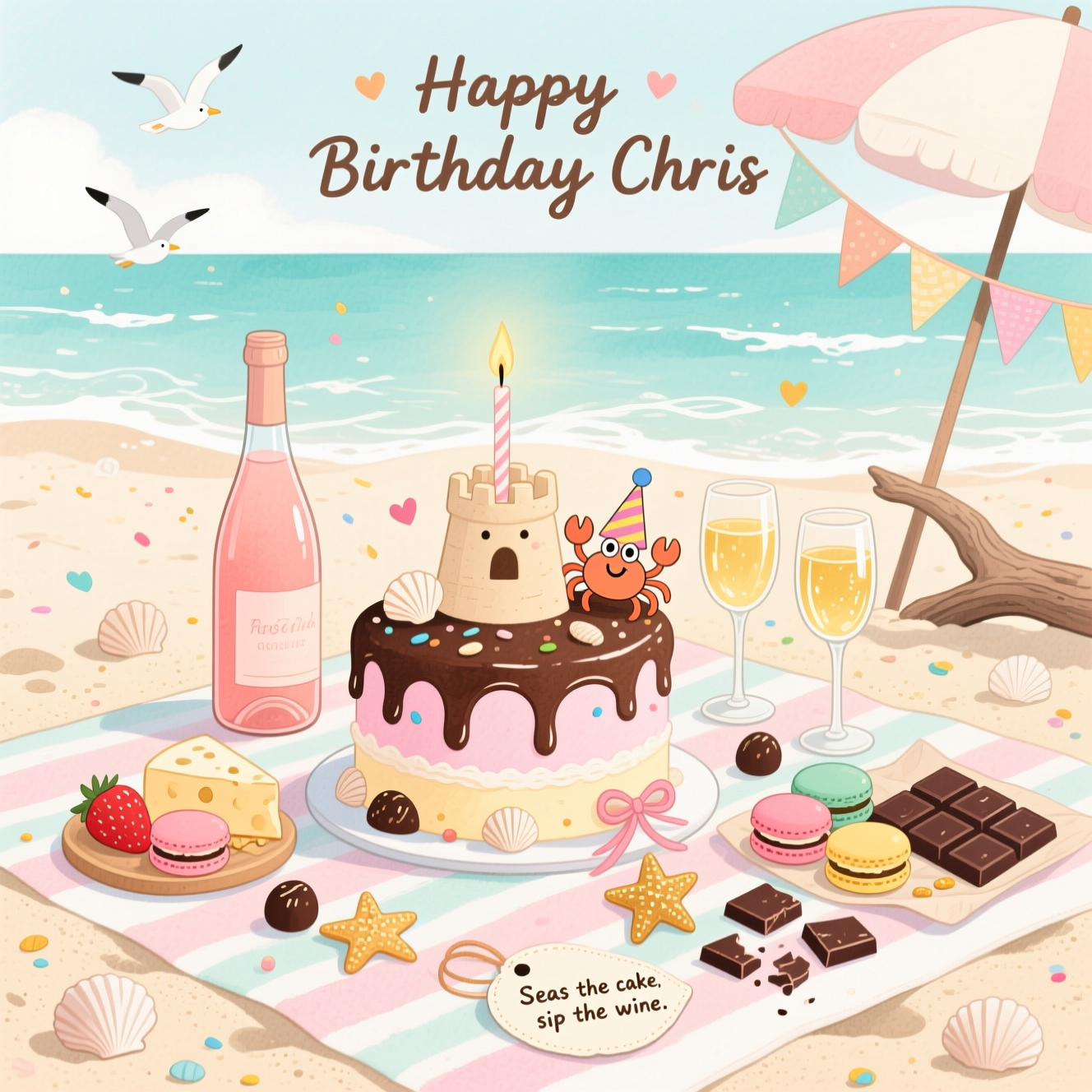 A cute, airy watercolor beach picnic scene in portrait orientation: a pastel sandcastle birthday cake with silky chocolate drip icing and seashell sprinkles sits on a striped blanket; one tall lit candle. Beside it, a chilled bottle of rosé wine with two clinking glasses catching golden highlights. A cheerful spread of food surrounds the cake—chocolate-dipped strawberries, a small cheese-and-cracker board, colorful macarons, and a few broken squares of dark chocolate on parchment. A tiny smiling crab in a party hat tugs a ribbon around the cake, starfish-shaped chocolate truffles dot the sand, and pastel bunting strings from a beach umbrella to a piece of driftwood.