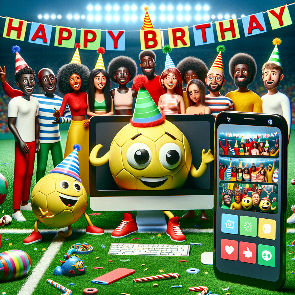 Create a vivid picture that oozes of a wonderful birthday celebration. The image involves a diverse group of friends, with Caucasians, Hispanics, Blacks, Middle-Easterns and South Asians equally present and huddled around a computer. The computer is aptly presenting a 'Happy Birthday' message across its screen. This gathering takes place on an eye-catching, lively green football pitch, where a charming, soft football wearing a festive party hat subtly lies nearby. Adjacent to this group, there's an anthropomorphic mobile phone, animated with a whimsical smile. It is busy capturing pictures of the unforgettable scene. The phone's screen is illuminated by a multitude of birthday emojis and festive notifications, contributing to the celebration vibe.