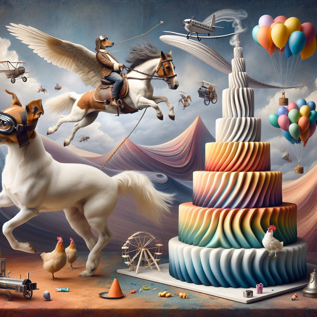 Create an image showcasing a whimsically surreal birthday tableau situated within an abstract landscape where gravity follows unusual rules. The scene includes a Jack Russell wearing aviator goggles, embarking on an imaginative journey atop a majestic horse which seems to be galloping through an ether awash with swirling colors. Also, portray a chicken whose feathers resemble balloons floating above them nonchalantly. The centerpiece of this dreamlike journey is an impossible cake, constructed step-pyramid style, where each layer represents a snapshot of beloved travel locations—an edible travel journey applauding the mastery of the improbable.