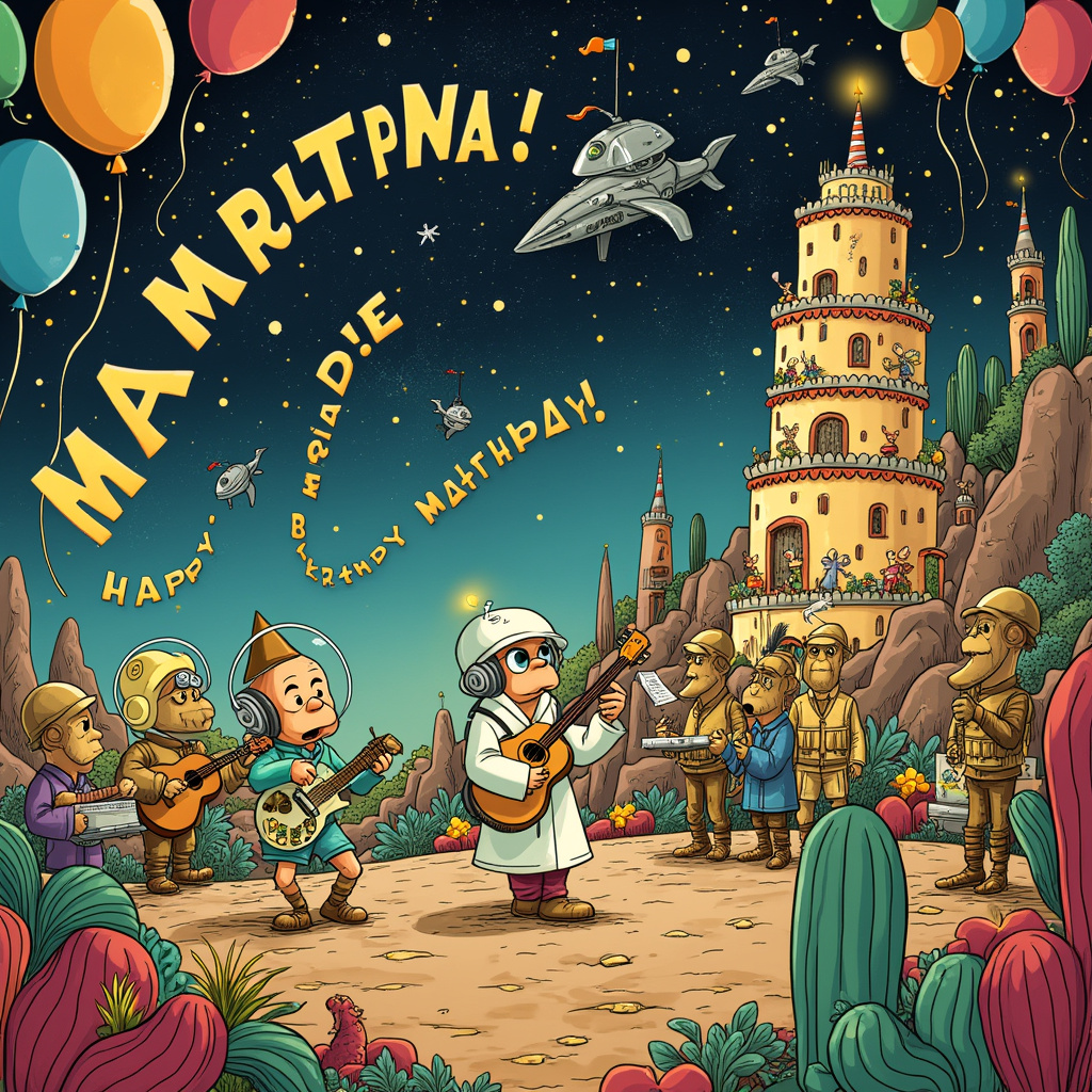 In the whimsical and zany style inspired by our eclectic mix of artists, we see a bustling, intergalactic birthday celebration on a distant planet reminiscent of the quirkiness from Hitchhiker's Guide to the Galaxy. The foreground features a playful alien band, complete with three-headed musicians playing futuristic instruments resembling both guitars and xylophones, channeling Bill Watterson's whimsy and Gary Larson's offbeat humor.