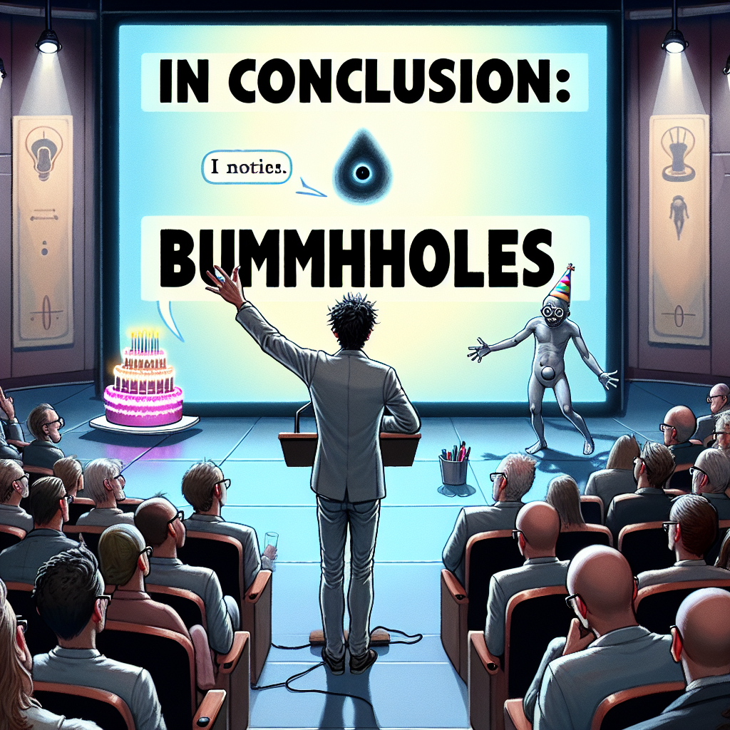 Generated with these themes: Sam, who has dark hair and glasses, is giving a lecture to a packed auditorium about his AI research paper for a famous conference , The screen Sam is presenting on just has the text "In conclusion: Bumholes" and nothing else, There is an evil AI somewhere in the background , and Someone is walking onstage with a party hat and birthday cake, saying to Sam "Happy Birthday!" In a speech bubble .