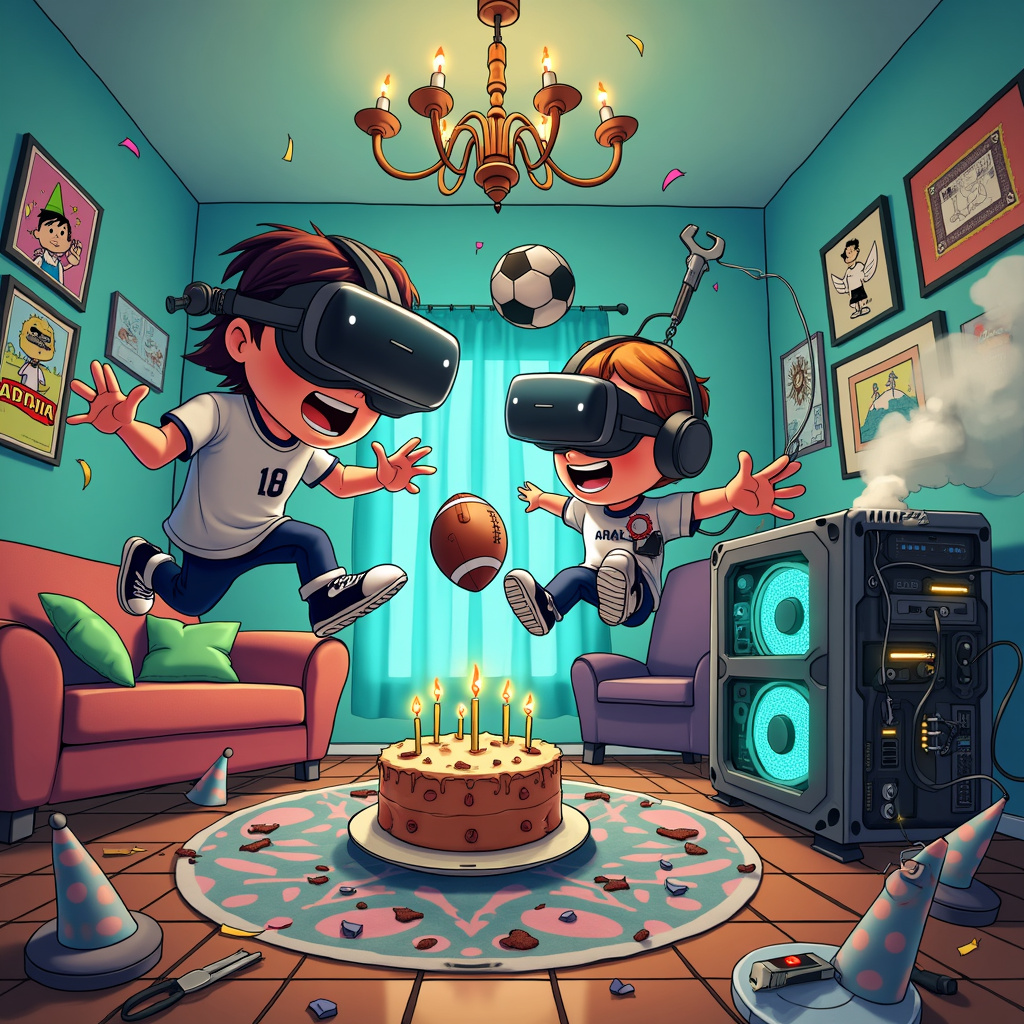 On the floor, there are scattered confetti, a half-eaten birthday cake with a football design, and some party hats thrown about haphazardly. The overall scene is packed with activity, each element playing into the themes of VR, Beat Saber, football, and PC engineering, all while maintaining a sense of comedic absurdity that makes it perfect for a birthday greeting card.