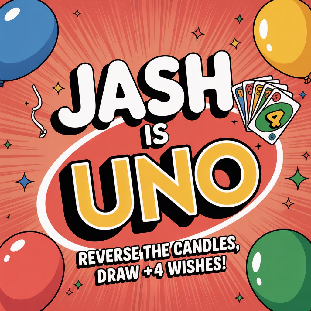 - Pose: Jash pops out of an oversized UNO deck box, beaming, holding the red “1” card high in one hand while a few cards flutter from the other.