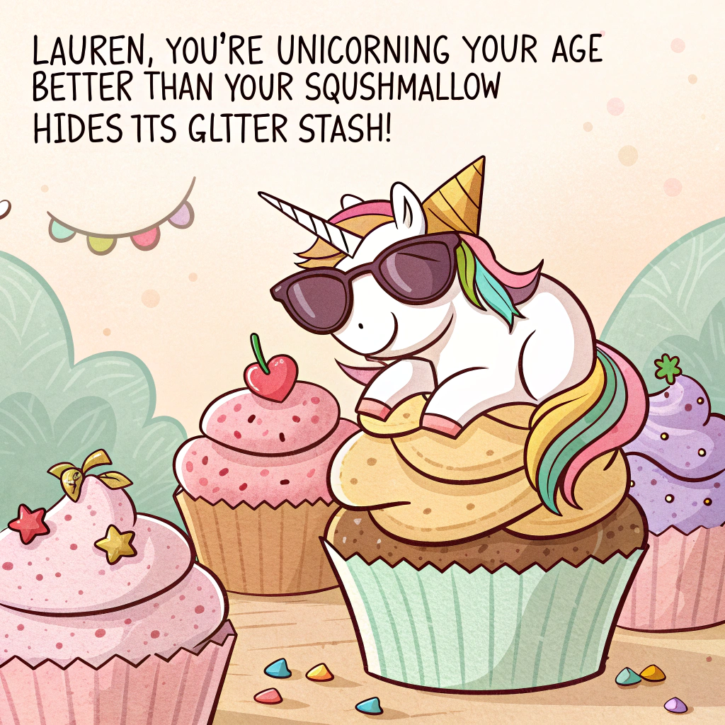 At the top of the image, "Lauren, you're unicorning your age better than your Squishmallow hides its glitter stash!"