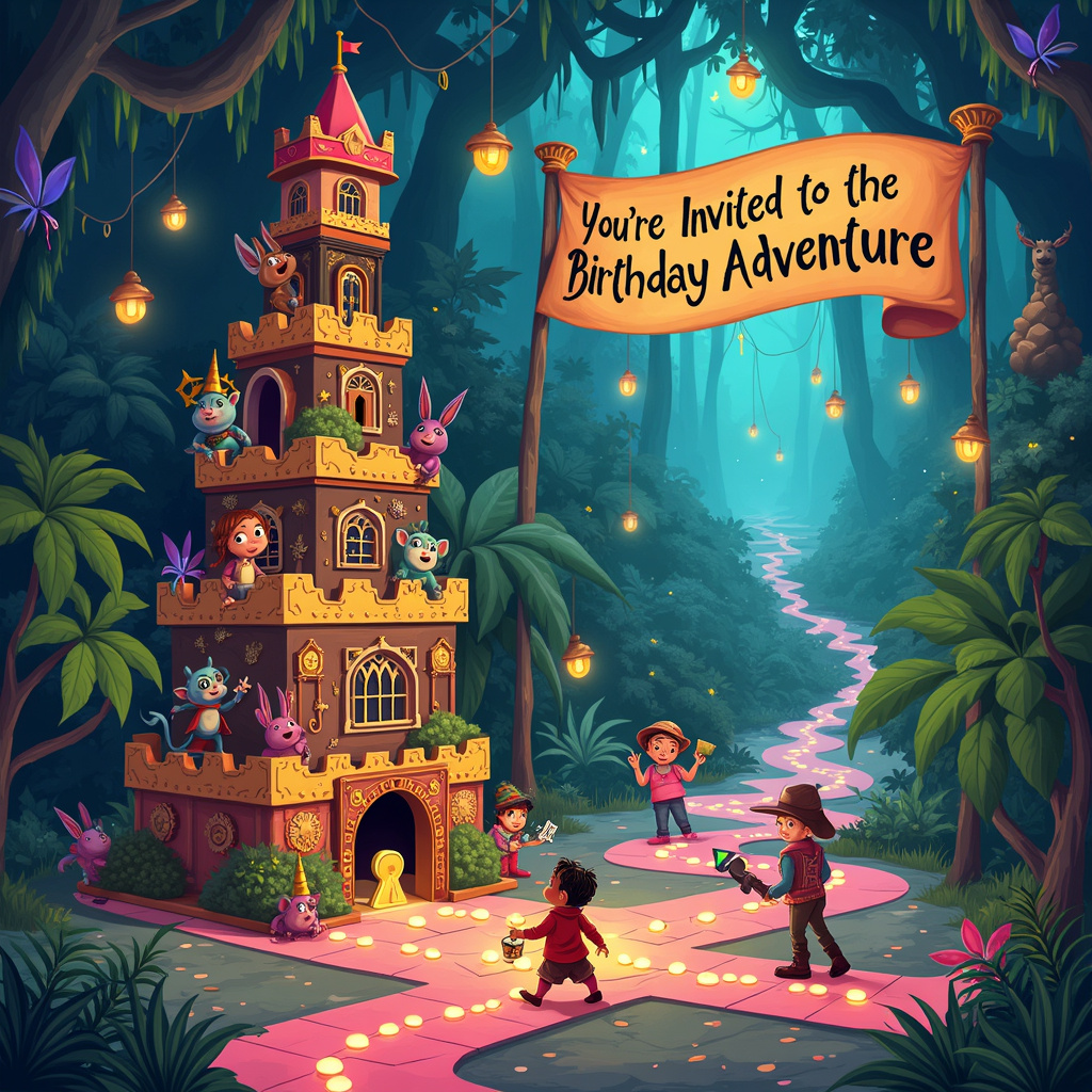 In the background, lush foliage reminiscent of Maxfield Parrish's dreamy landscapes adds depth, with fantastical creatures flitting among the leaves, their wings sparkling like jewels. Overhead, a banner with intricate calligraphy – reminiscent of Gustave Doré’s detailed line work – waves gently, reading “You're Invited to the Ultimate Birthday Adventure!”