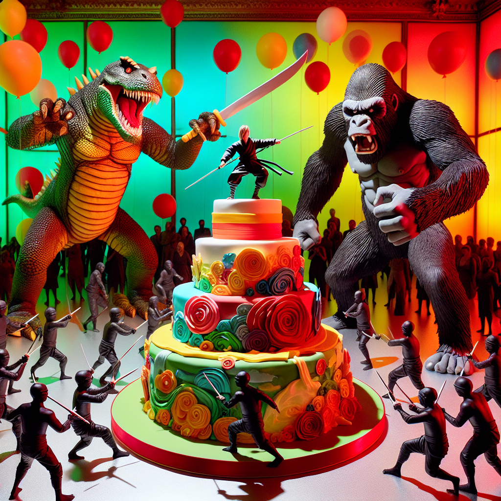 In the midst of a strikingly colorful party scene, a grand, multi-tiered cake takes the spotlight, topped with an edible figurine of a stylized ninja in a battle stance. Surrounding the cake, towering figures of a fierce, giant reptile and an immense ape wrestle in a delicate waltz of mayhem, extrapolated with intricate fondant and sugar artistry. Balloons hover in strange arrangements, distorting the room's reality, prompting the ethnically diverse, gender-balanced guests to question if they have crossed into a vivid dream celebrating another lap around the sun.