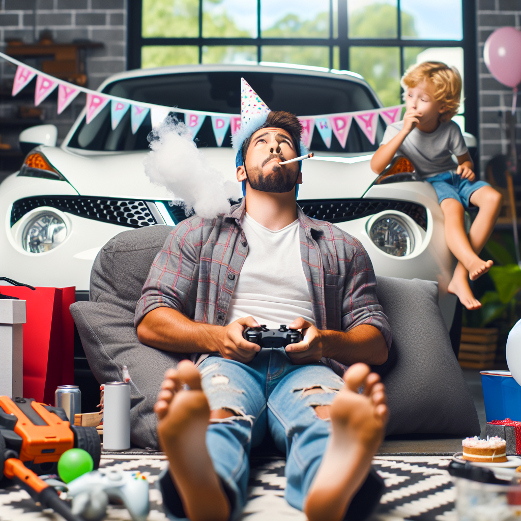 The image portrays a vibrant and jovial birthday ambiance with a relaxed atmosphere. Center stage features a young, Hispanic man, presumably a roofer by the attire he wears, engrossed in an Xbox game while casually vaping. His feet are up in a carefree manner with a faint smirk decorating his face. In the backdrop, his white Nissan Juke is parked, providing a glimpse of his personal life. Nearby, his young son with blond hair playfully mimics his father with a toy controller, capturing a heartfelt father-son moment amidst the humorous birthday scenario.