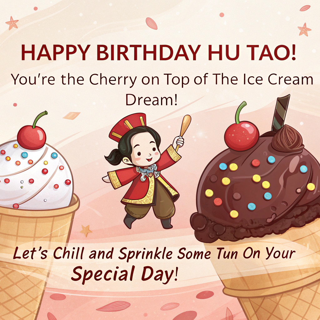 At the top of the image, "Happy Birthday, Hu Tao! You're the cherry on top of the ice cream dream!"