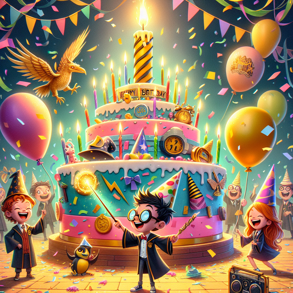A lively, cartoon-like birthday scene takes place, adorned with numerous colorful confetti and fanciful streamers. The focus lies on a grand, animated cake topped with glimmering candles and decorated with round spectacles, a lightning bolt symbol, and a spherical golden object with wings. Imaginary, unnamed characters in wizarding robes and party hats happily dance around the cake. One of them, a young boy with black hair, glasses, and a lightning bolt scar, waves a wand joyfully. Overhead, balloons seemingly enchanted with a levitation spell idle in the air, nudging the atmosphere into magical hilarity.