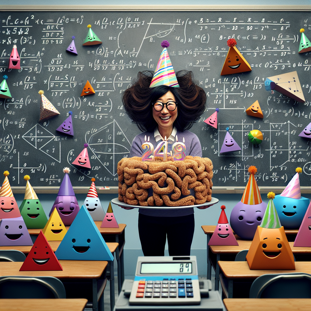 A humorous illustration for a birthday card shows a classroom with a blackboard filled with complex equations. In the center, a math teacher with exaggeratedly messy hair holds an ornate birthday cake in the shape of a calculator. Party hats sit atop the heads of geometric shapes like triangles and circles, which double as cheerful students.