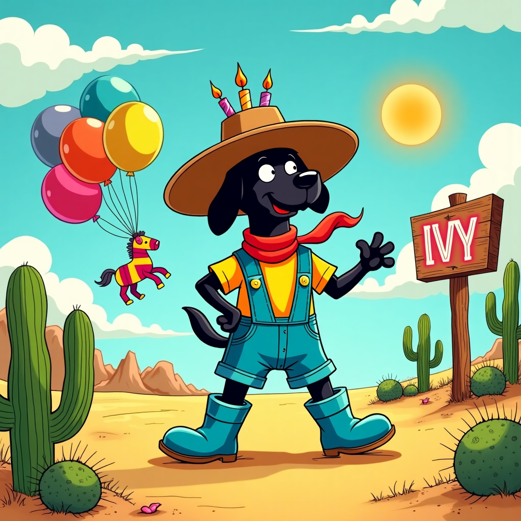In the background, a western-themed birthday scene unfolds. The ground is a rich, sandy yellow, reminiscent of a cartoon desert. Dotted around are cacti with multicolored balloons tied to them, swaying in the imagined breeze. These balloons are a kaleidoscope of colors—red, blue, green, and purple—with small, cartoonish faces drawn on them, inspired by Gary Larson's wit.