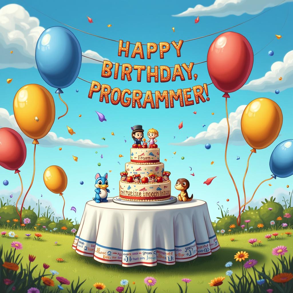 A colorful cartoon scene set in a bright, open field under a clear blue sky. In the center, there's a large, round table covered in a white tablecloth with a binary code patterned trim (0101 Birthday!). Atop the table sits a three-tiered birthday cake decorated with fondant figures of classic programming languages' mascots, such as Java's Duke, Ruby's Ruby and Python's snake, each holding a balloon. Behind the table, a banner with the words 'Happy Birthday, Programmer!' flutters. Its letters are made of various coding symbols like curly braces, angle brackets, and semicolons. Scattered around are helium balloons shaped like common programming icons—arrows, gears, and computer mice. To the side, a set of cardboard cutouts depicting well-known IDEs where guests can pose for pictures. The gifts are wrapped in paper patterned with coding 'Hello, World!' script in multiple languages.