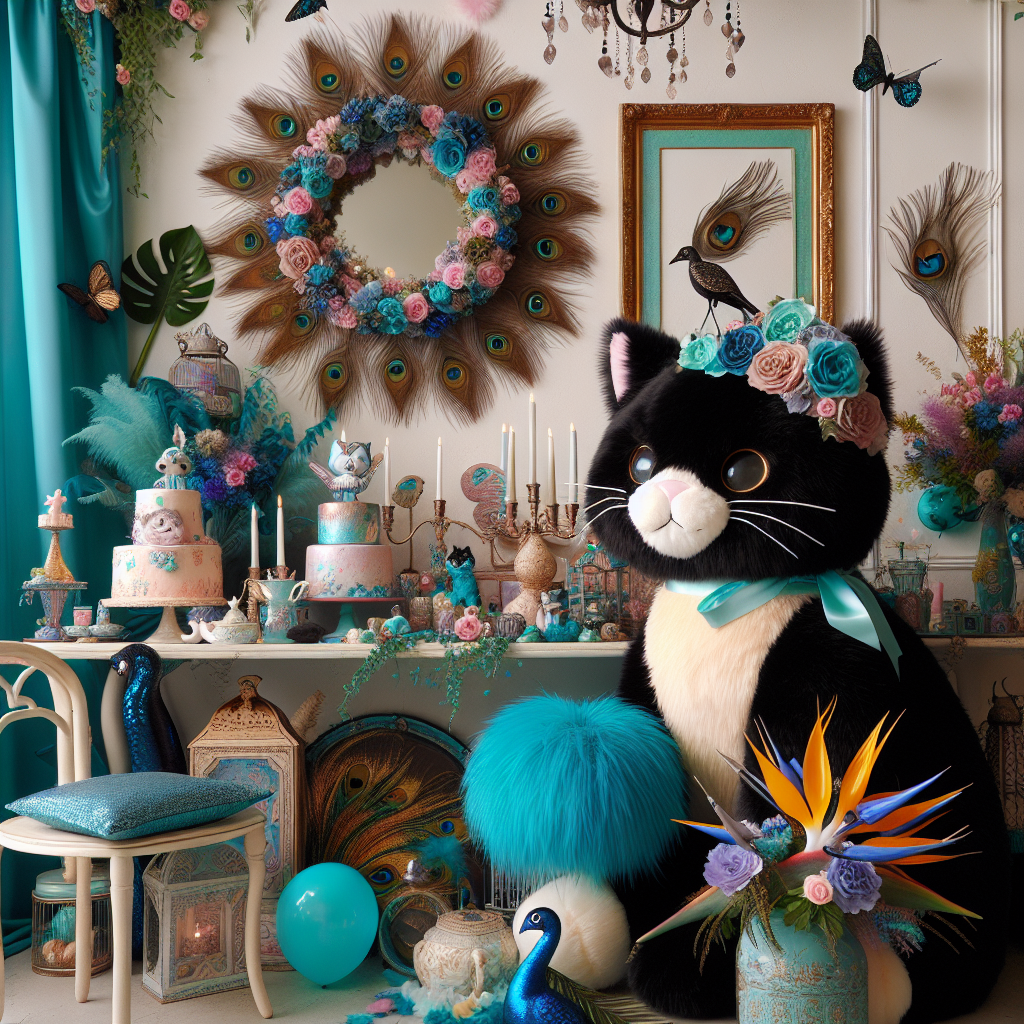A quaint birthday setting that exudes authenticity, where a plush, soft cat takes center stage in the midst of a playfully charming atmosphere tinged with elements of gothic elegance. Vibrant turquoise accents fill the space, alongside decorations of a general cute feline theme that infuse a dash of whimsy. Artfully arranged peacock feathers hint at sophistication, while tropical bird of paradise flowers bring in vivacious colors that align with the lively ambiance. Delicate butterfly wings, possibly elements of a costume or decorative wall art, subtly flutter in the festive environment, contributing to the immersive, multisensory experience.
