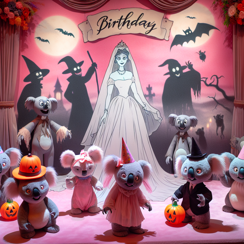Envision a birthday scene that marries the joy of celebration and the uncanny aesthetics of Halloween. The backdrop is flushed with mild pink shades, contrasting with the cartoon-style characters adorned in Halloween garb, bearing a resemblance to the cheerfulness seen in early 1900s animation. A spectral bride roams among them, her likeness a homage to macabre tales popular during the Victorian era. Scattered across the setting, koala bears plush toys festively dressed in tiny witch hats or pumpkins are seen, adding a delightful quirk to the overall party decoration.