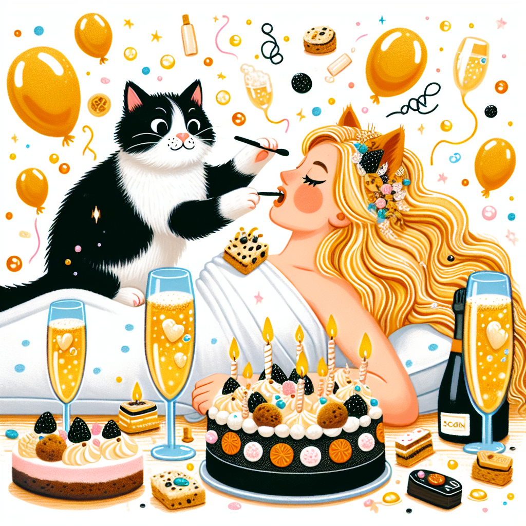 In this delightful birthday-themed illustration, the celebration is in full swing with two cats, one black and white and the other ginger, cheekily nibbling on gourmet vegan treats. Pops of birthday merriment are scattered throughout as one of the cats playfully swats the effervescent bubbles rising from their prosecco glasses. The scene is centered around an individual with golden-blonde hair, suggesting a restful spa day, symbolizing a moment of self-care and luxury amidst the birthday festivities.