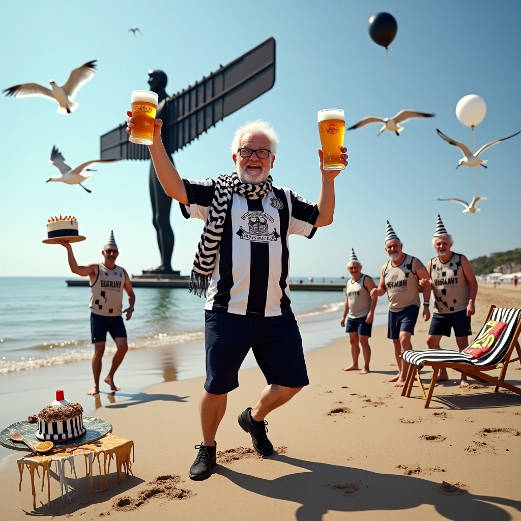 Create a funny and highly realistic photograph-style image of Arthur’s 80th birthday celebration, set on the sunny Whitley Bay beach. In the scene, Arthur—an elderly Geordie lad with a Newcastle United scarf and black-and-white football shirt—is dancing triumphantly on the sand while balancing a frothy pint of local beer in one hand and a glass of fine whisky in the other. Behind him, the majestic Angel of the North is humorously photoshopped standing in the water like a cheeky paddler, holding a "Howay the Lads!" birthday banner. In the background, seagulls fly over a cheerful party setup with black-and-white striped balloons, while some rowdy, jubilant pensioners (also dressed as Toon fans) toast with beer steins. Add details like a beach deckchair that’s half sunk in the sand with a Tynemouth-themed cake melting in the sun, and party hats on surfboards drifting past. Capture it all with bright natural lighting and vibrant, tongue-in-cheek realism.