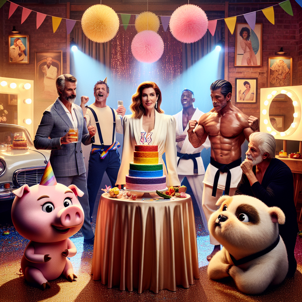 An enchanting birthday scene radiates a celebratory ambiance. The life of the party is an elegantly dressed animated pig character, situated in the center. On one side, two adult Caucasian male TV presenters are seen around a rainbow-colored cake guessing the right number of cake layers to represent LGBTQ pride. On the other, an adult Caucasian male martial artist admires a vintage car photo booth. Providing additional charm and humor to the scene is a chubby dog, wearing a party hat, waddling around and entertaining the guests. High-energy pop music sets the energetic backdrop for the party.