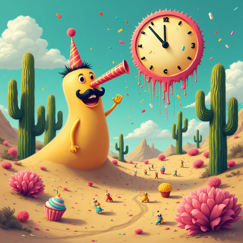 **Image Prompt:** A whimsical, surreal desert landscape where giant cacti are shaped like bizarre, oversized meth pipes. The sun in the sky is a huge, melting clock with vibrant colors cascading down like liquid time. In the center, a giant, grinning sand dune with a mustache, wearing a party hat and blowing a party horn. Small, dancing sugar cubes with tiny legs and arms surround the dune, tossing confetti made of colorful pills into the air. The ground is scattered with surreal, twisting shadows of dancing figures and abstract shapes. A tumbleweed shaped like a cupcake rolls by, leaving a trail of frosting.