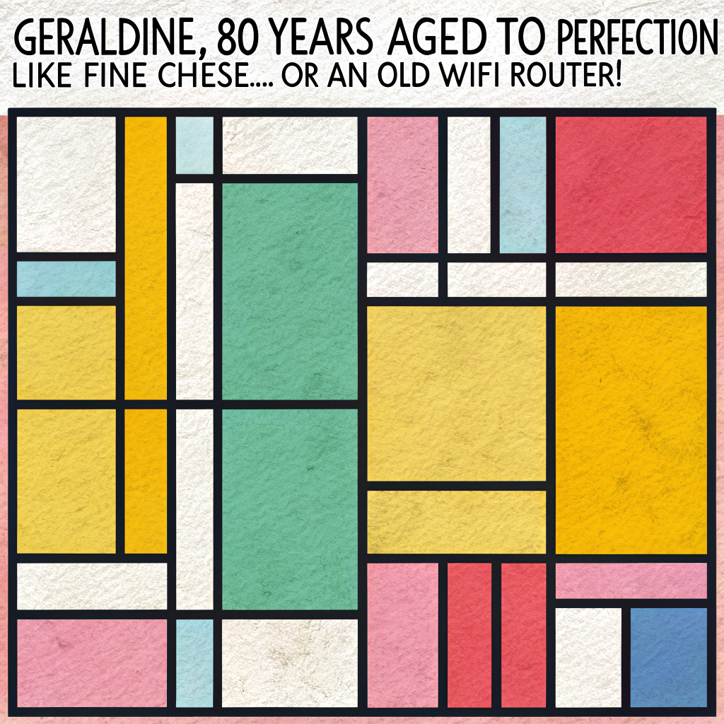 At the top of the image, "Geraldine, 80 Years Aged to Perfection – Like Fine Cheese... or an Old WiFi Router!"
