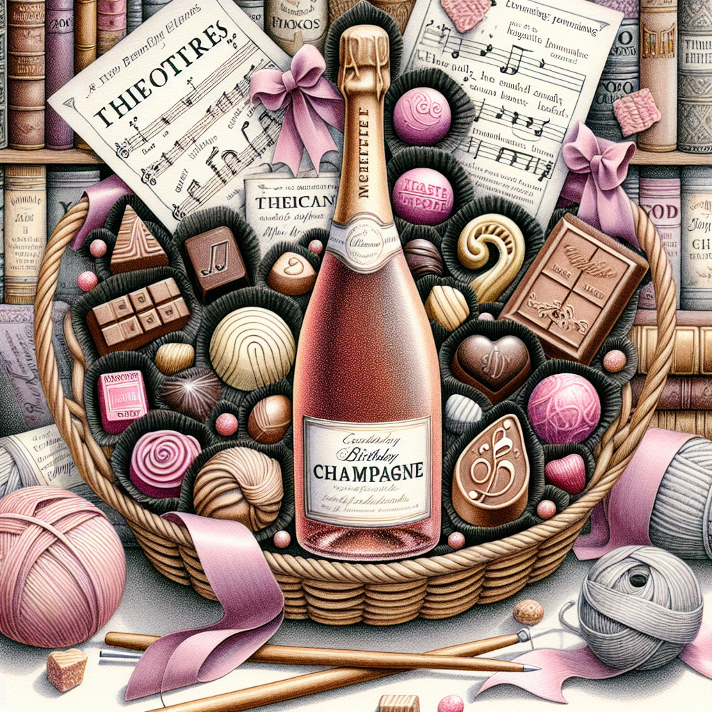 This endearing illustration captures the essence of a birthday celebration with a penchant for the finer things. At the heart sits a dainty bottle of pink champagne, its label hinting at a joyous occasion, with an array of luxurious chocolates fashioned into musical notes scattered around, as if they've tumbled out in celebration. Theater playbills and book spines create a unique backdrop, suggesting a love for musicals and literature. In the foreground, a knitting basket filled with pastel yarns and elegant knitting needles invites the viewer to appreciate the quieter joys of the birthday milieu.