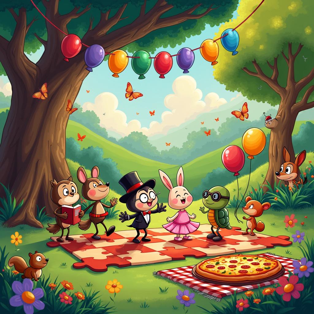 The scene unfolds in a lush, vibrant forest clearing, bathed in the soft, golden light of late afternoon. In the center, a large tree with sprawling branches forms a natural canopy, adorned with colorful balloons tied to the branches that sway gently in the breeze. Below the tree, a whimsical dance floor made of interlocking, oversized puzzle pieces is set up, where a diverse group of cartoon animals are joyfully dancing. A wise owl wearing glasses and holding a psychology book leads a line dance with a fox in a top hat, a rabbit in ballet shoes, and a turtle with a monocle. To the right, a large, cartoonish pizza, sliced and ready to be shared, is placed on a red-and-white checkered picnic blanket, surrounded by happy, anthropomorphic mushrooms, peppers, and olives dancing around it. Above, fluffy clouds spell out "Happy Birthday Dr. Zandi" in playful, looping letters. In the background, towering trees and vibrant flowers envelop the clearing, while a few woodland creatures peek out, watching the festivities with delight. Butterflies flutter about, and a cheerful squirrel, donning a tiny party hat, holds a balloon in one paw and a slice of pizza in the other. The entire scene is bursting with lively colors and intricate details, blending the whimsical charm of Charles Schulz, the dynamic storytelling of Walt Disney, and the imaginative creativity of Bill Watterson, creating a delightful and memorable birthday scene for Dr. Zandi.