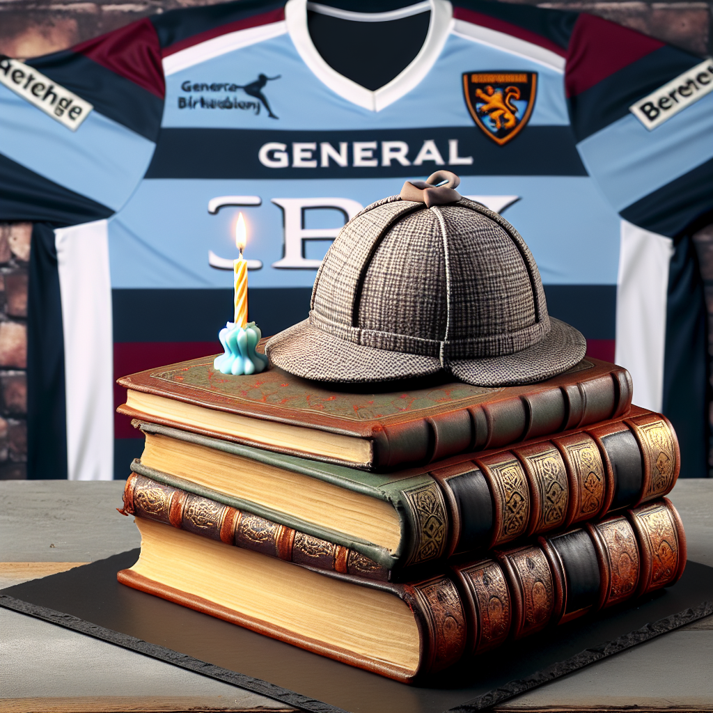 Generate an image staging a birthday celebration. The backdrop features a decorated jersey of a general football team, setting a sporty vibe. In the foreground, a uniquely-shaped cake looks like a pile of antique, leather-bound history books. An iconic detective's deerstalker hat sits spiritedly on the top layer, next to a single candle anticipating a birthday wish.